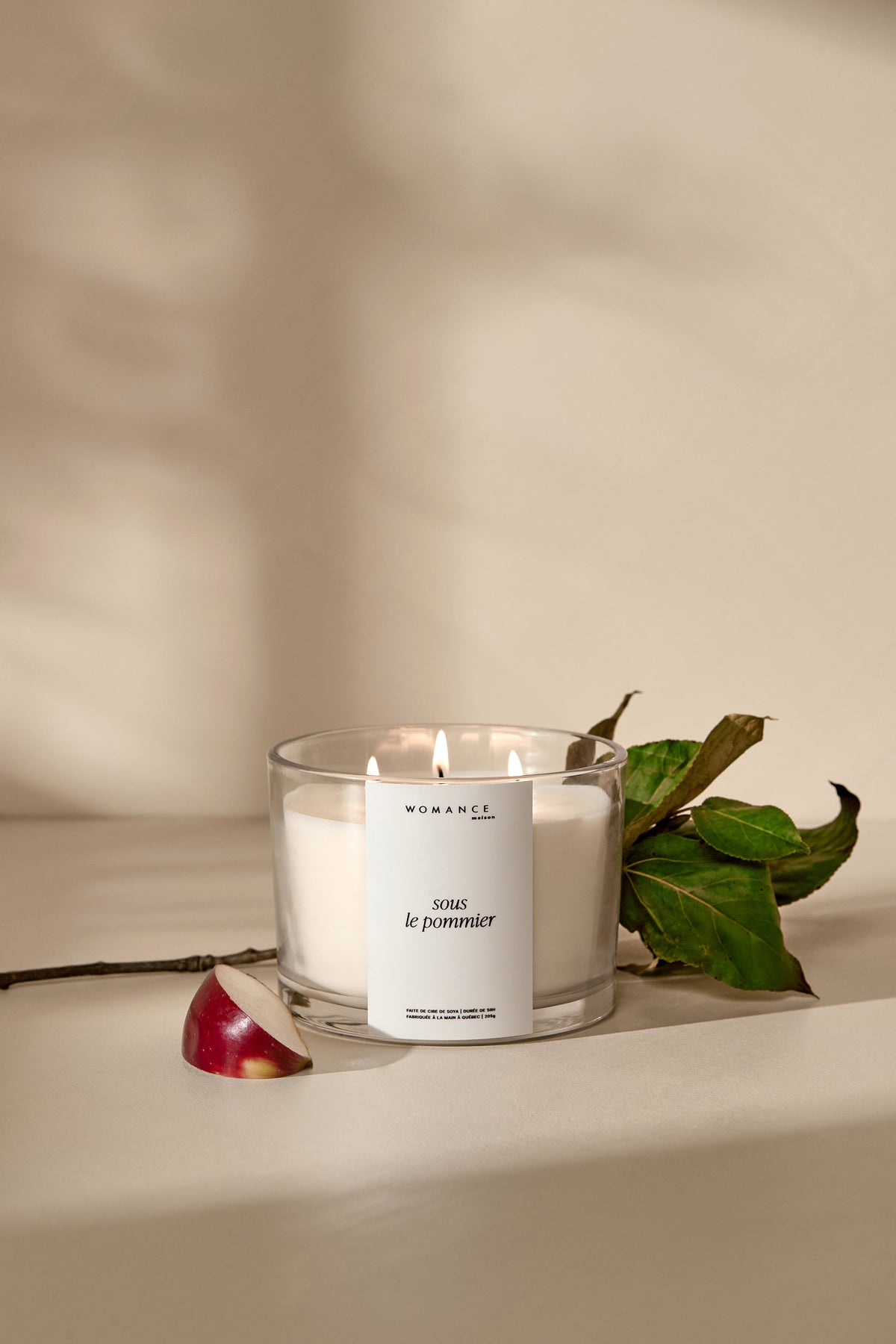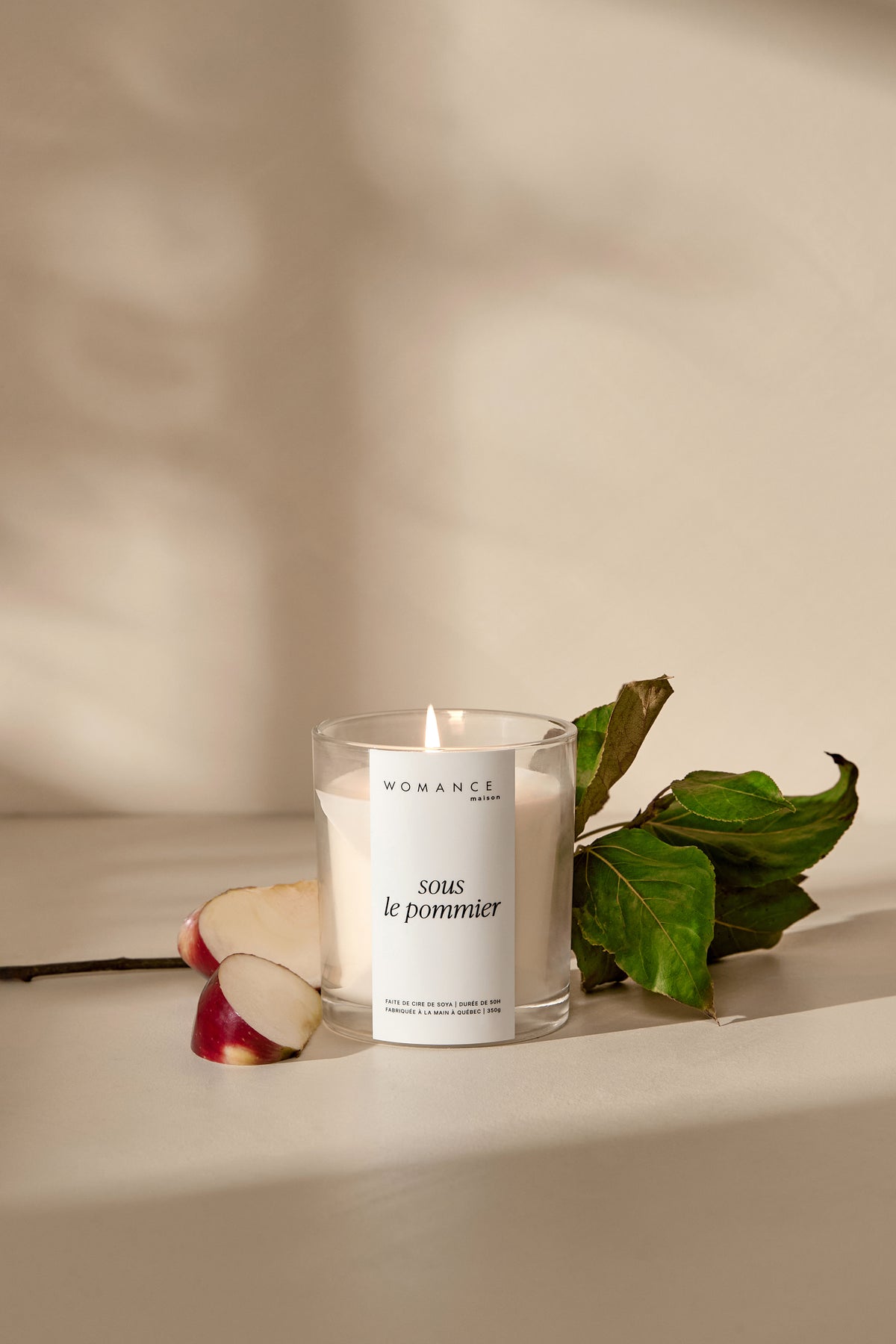Évadez-vous dans un verger fruité avec la chandelle Sous le pommier, où les notes de pomme fraîche et de fleurs créent un moment de détente et de réconfort.