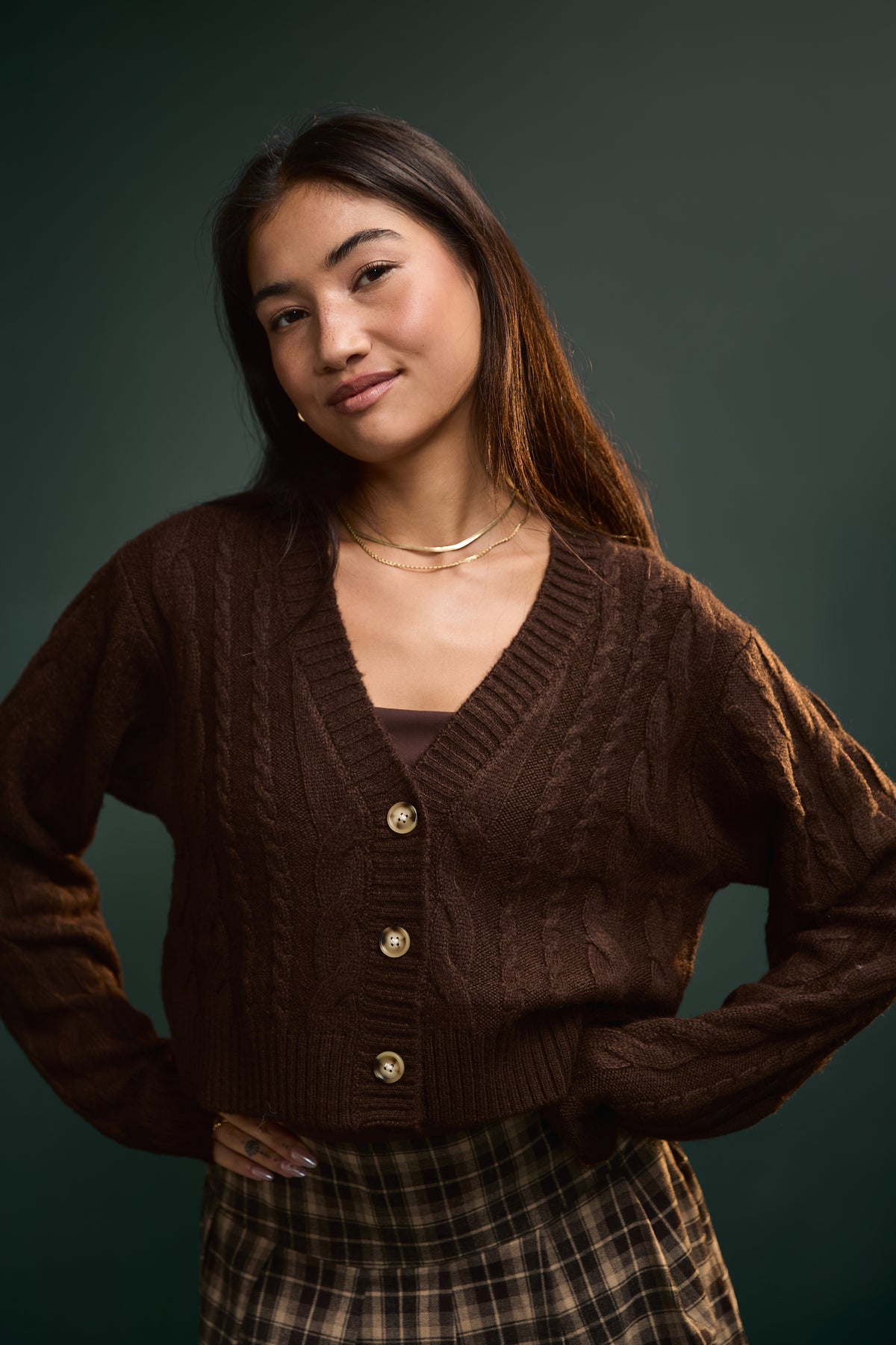 A soft and comfortable cardigan with a loose fit and slightly cropped length, perfect for layering with style or wearing with high-waisted pants.