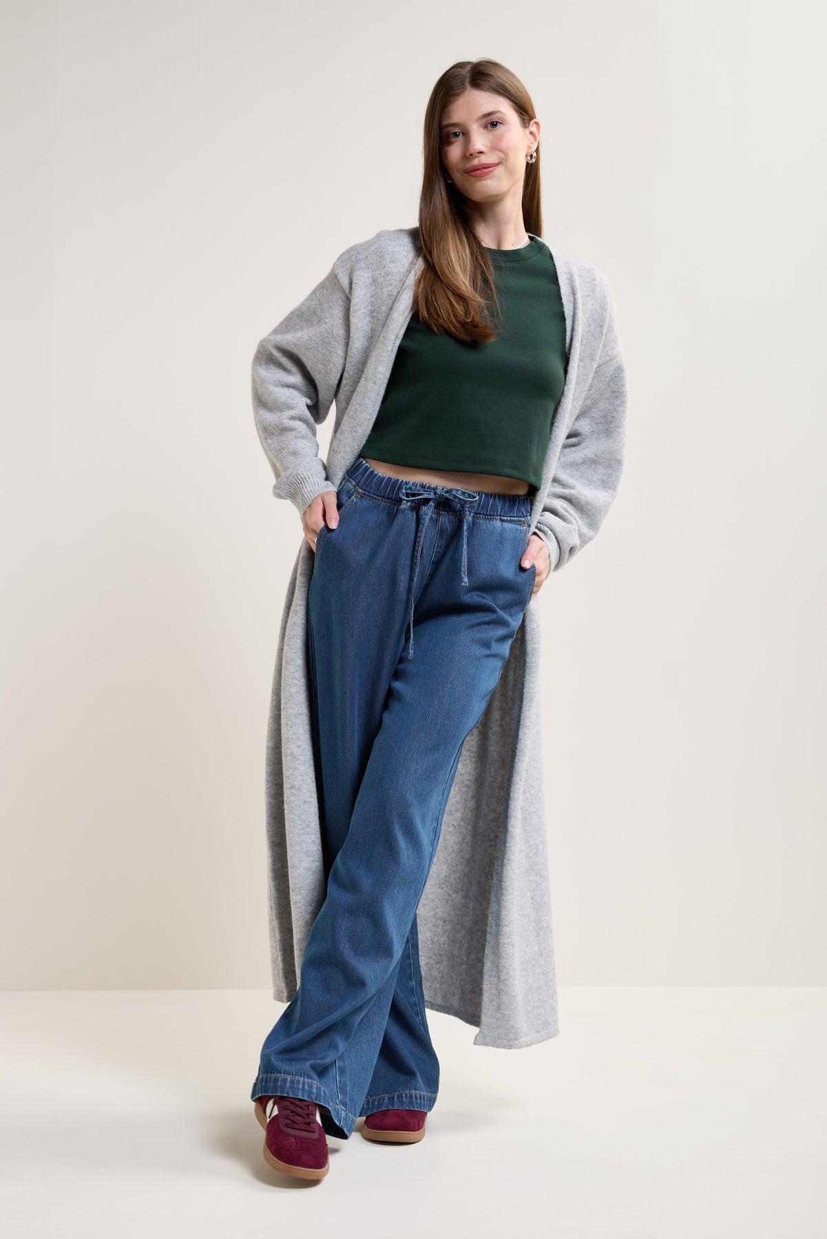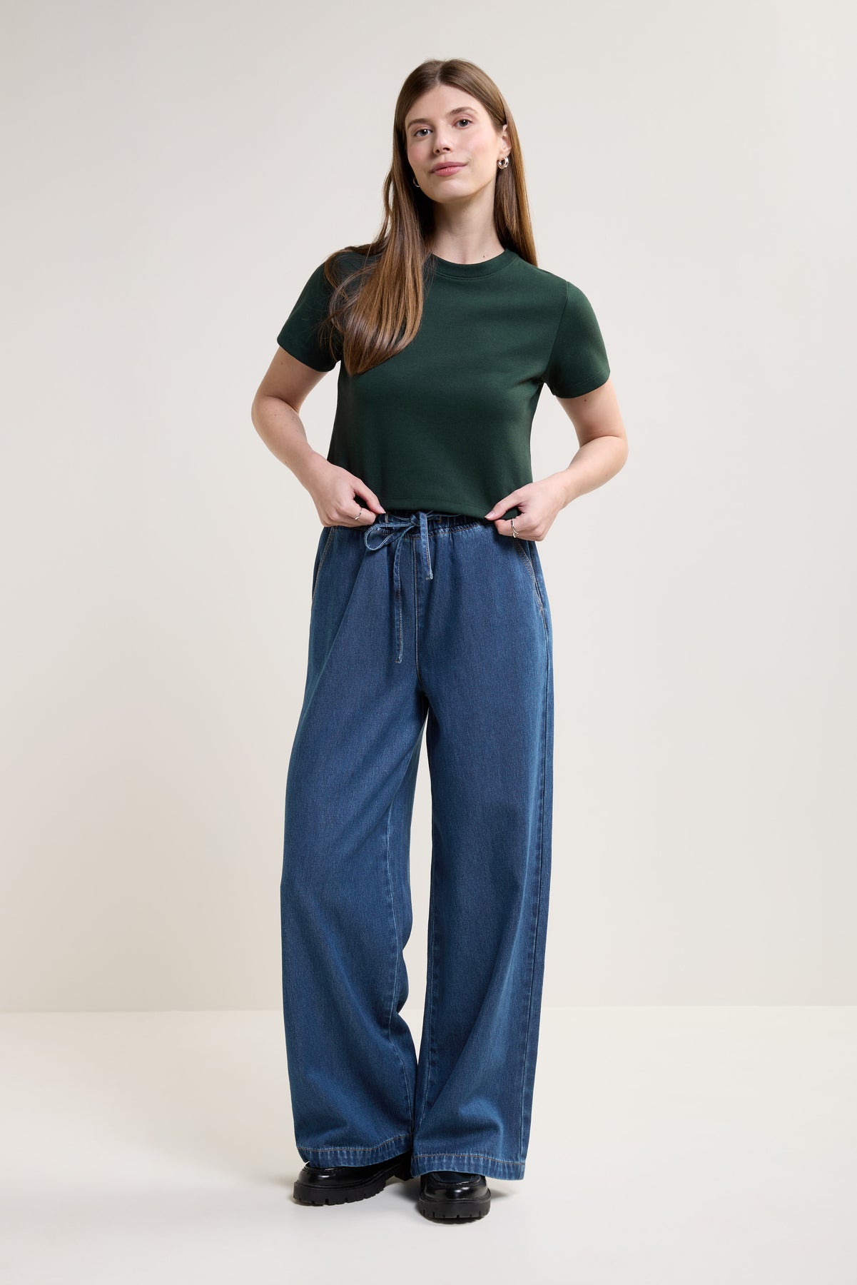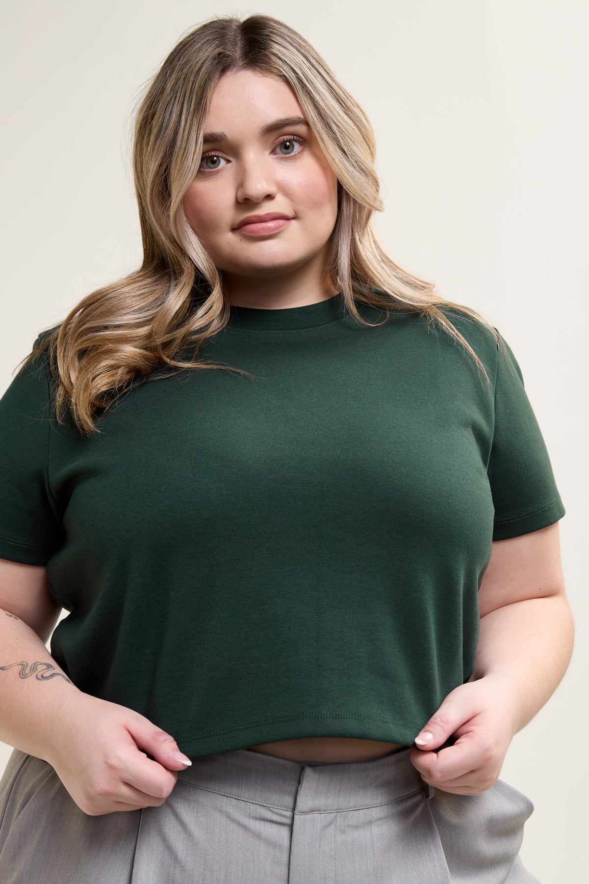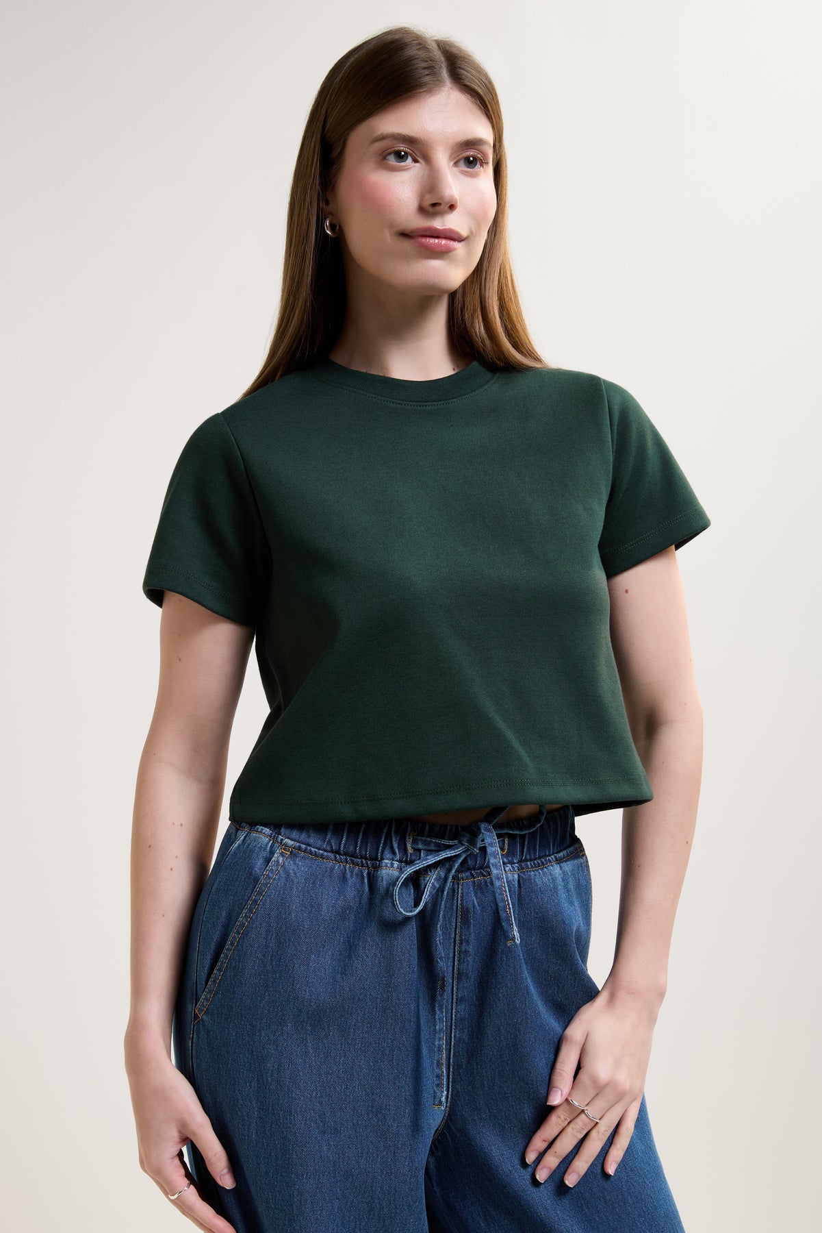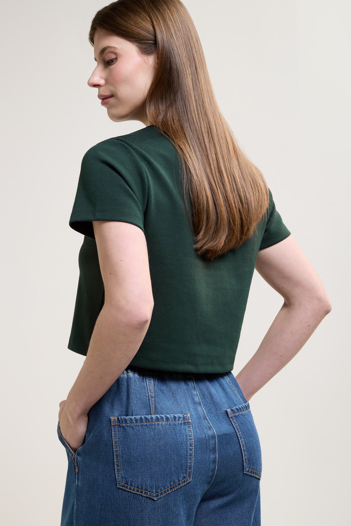 This slightly loose-fitting cropped t-shirt pairs easily with jeans, high-waisted pants, or a skirt for a simple, contemporary look. Its cropped length makes it a great base piece to mix and match with seasonal colors, whether for everyday wear or a more refined outfit.