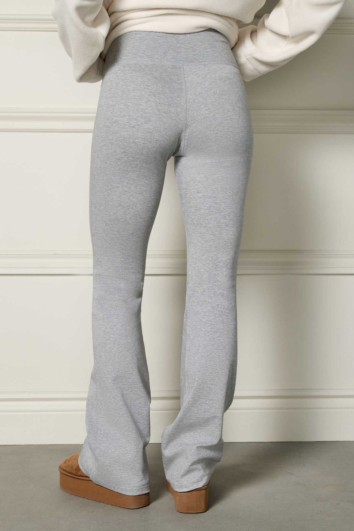 Flared leggings in a grey heathered stretch fabric with a lined waistband for optimal support. Their long, form-fitting cut offers comfort and style!