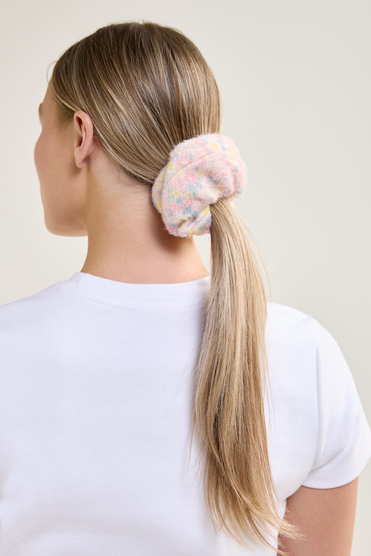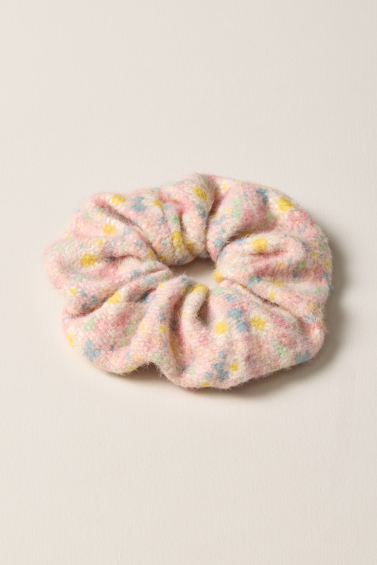 This textured knit scrunchie adorned with delicate flowers gently decorates your ponytails with softness and volume without damaging your hair.