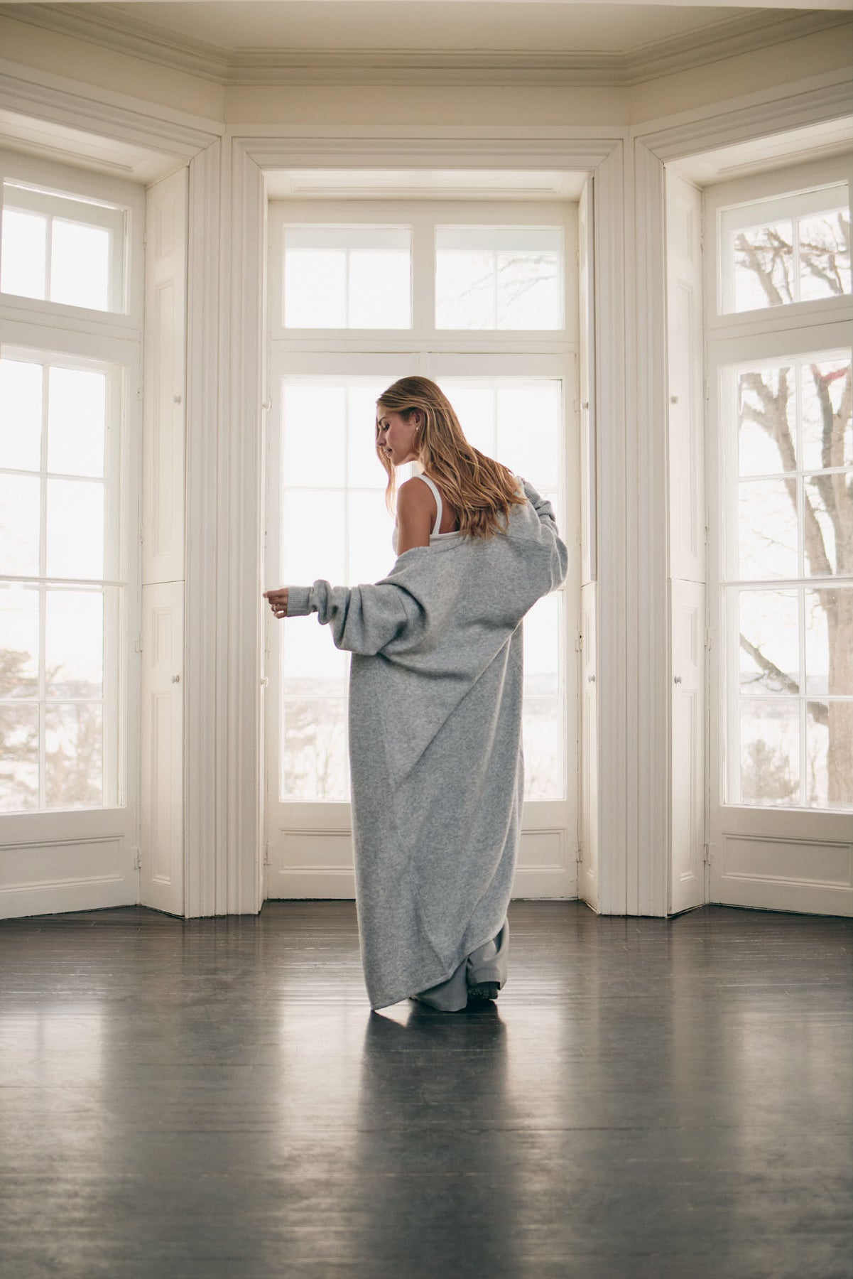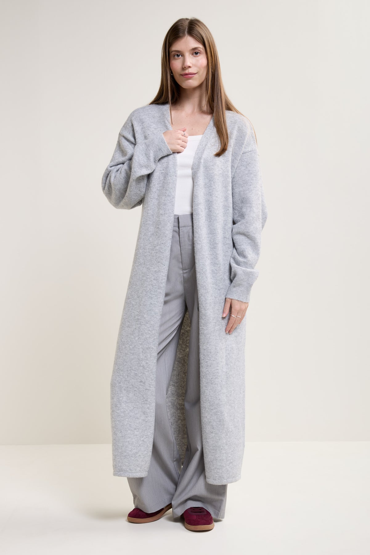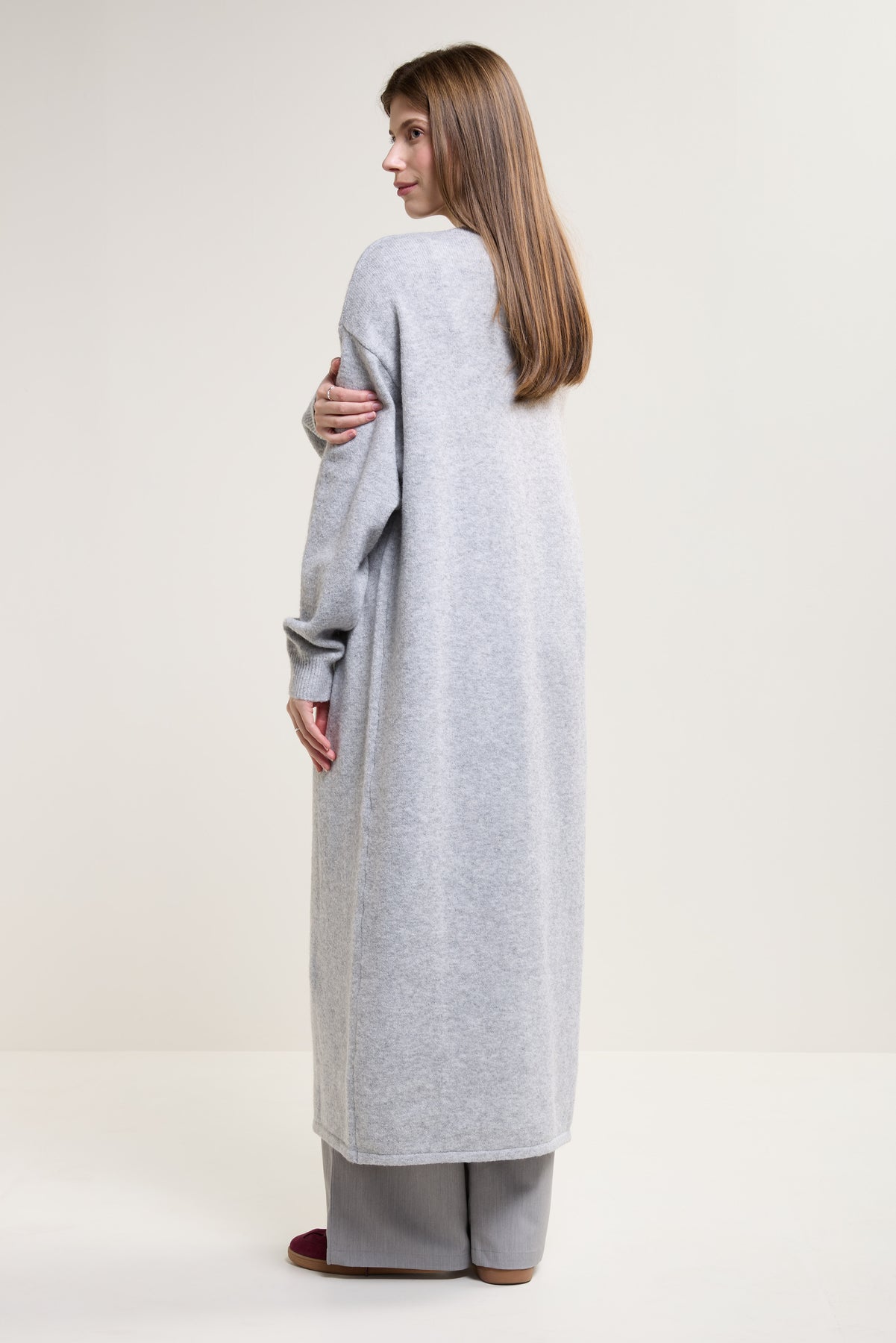 This long knit cardigan looks chic with tailored trousers at the office or worn comfortably at home. The loose fit and extra-long length make it easy to layer with other pieces.
