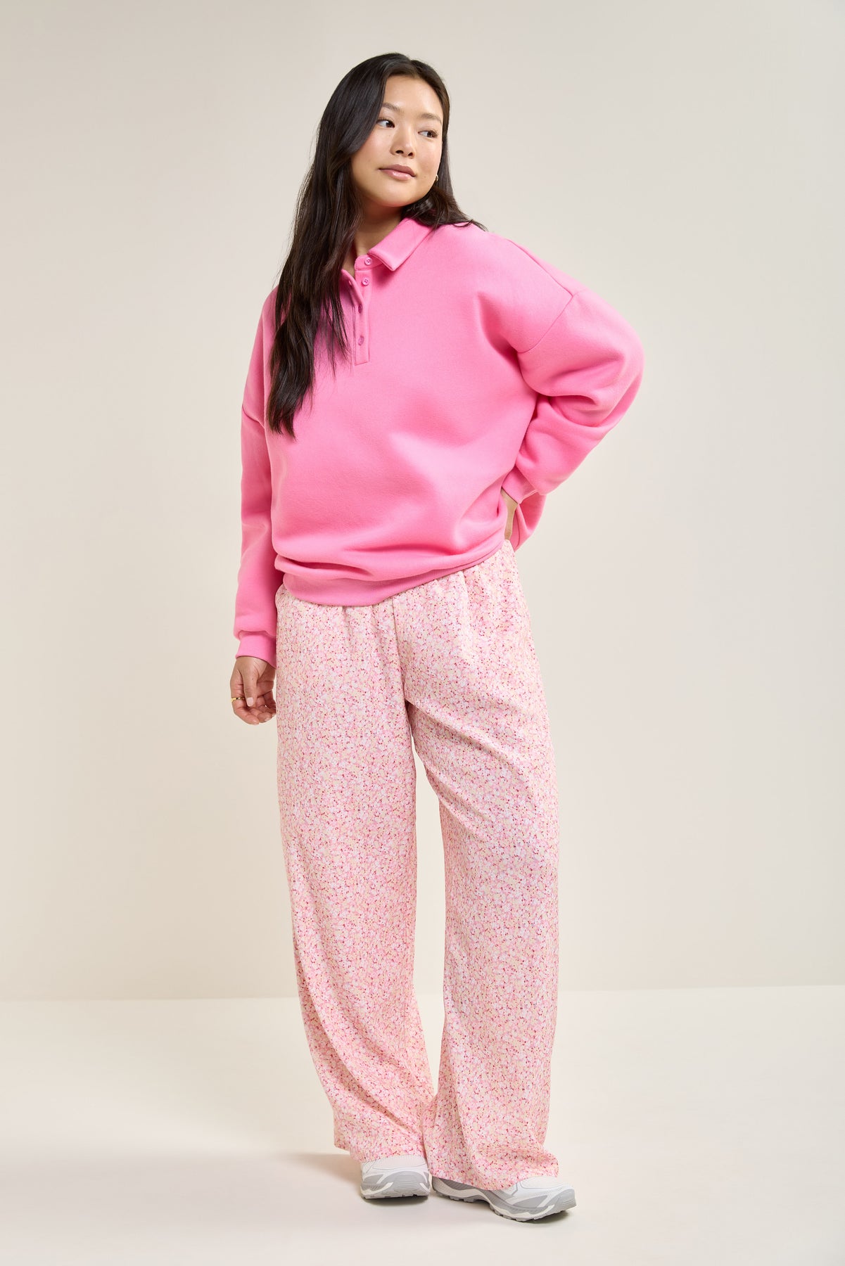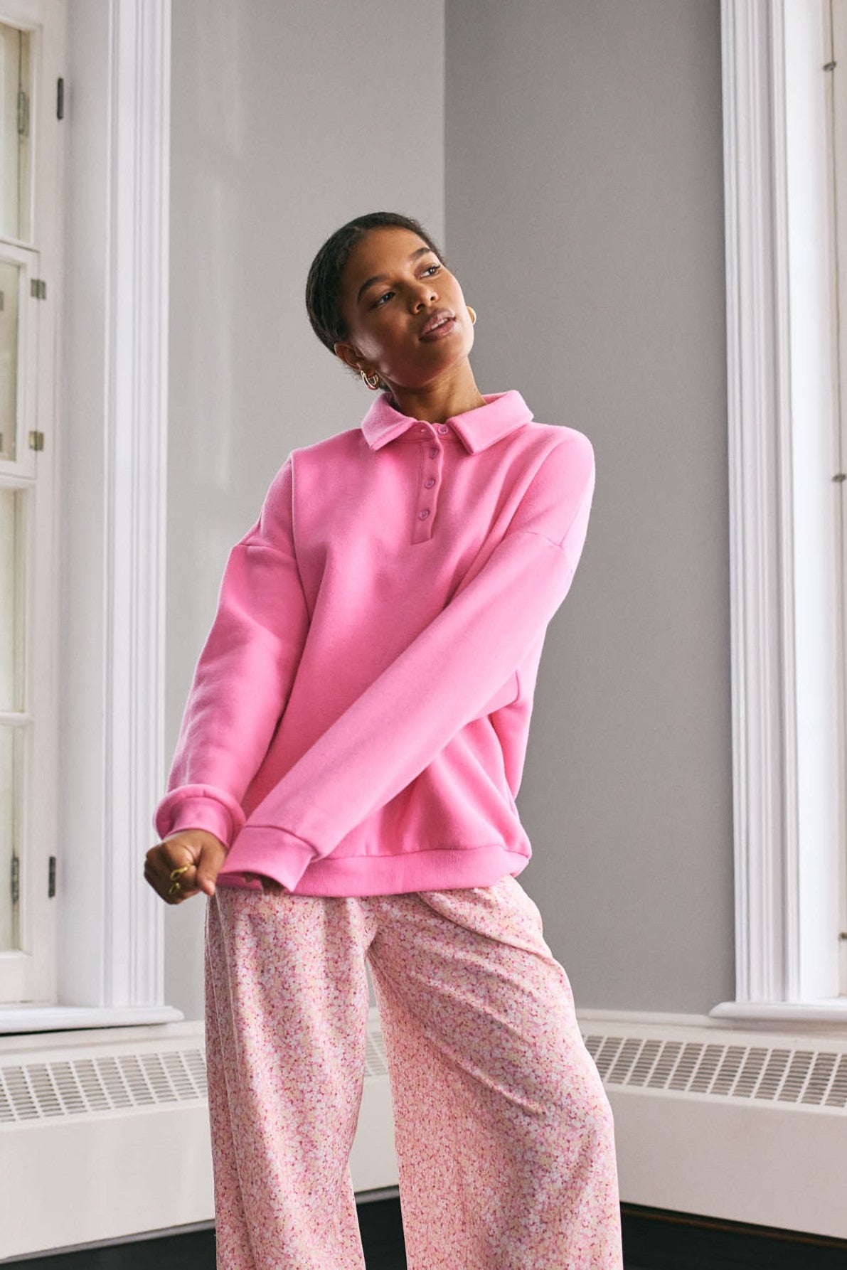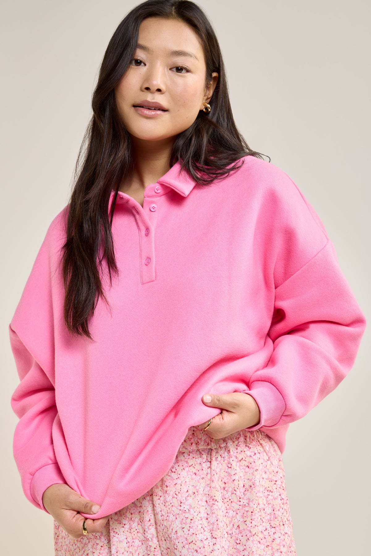 This ultra-comfortable fleece sweater revamps a classic style with its loose fit and buttoned polo collar, perfect for pairing with flowy pants or jeans.