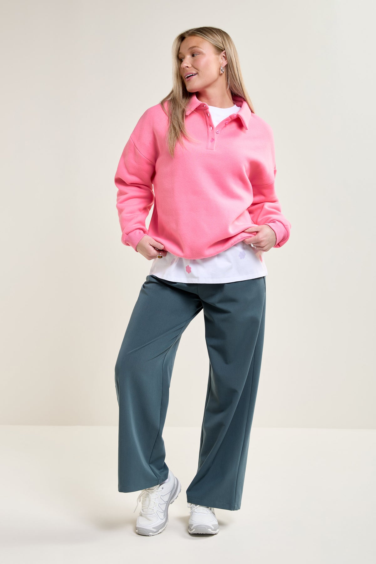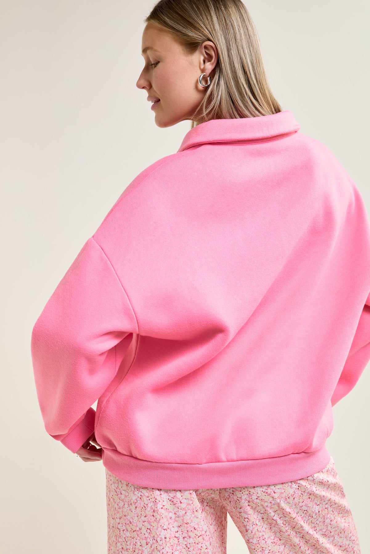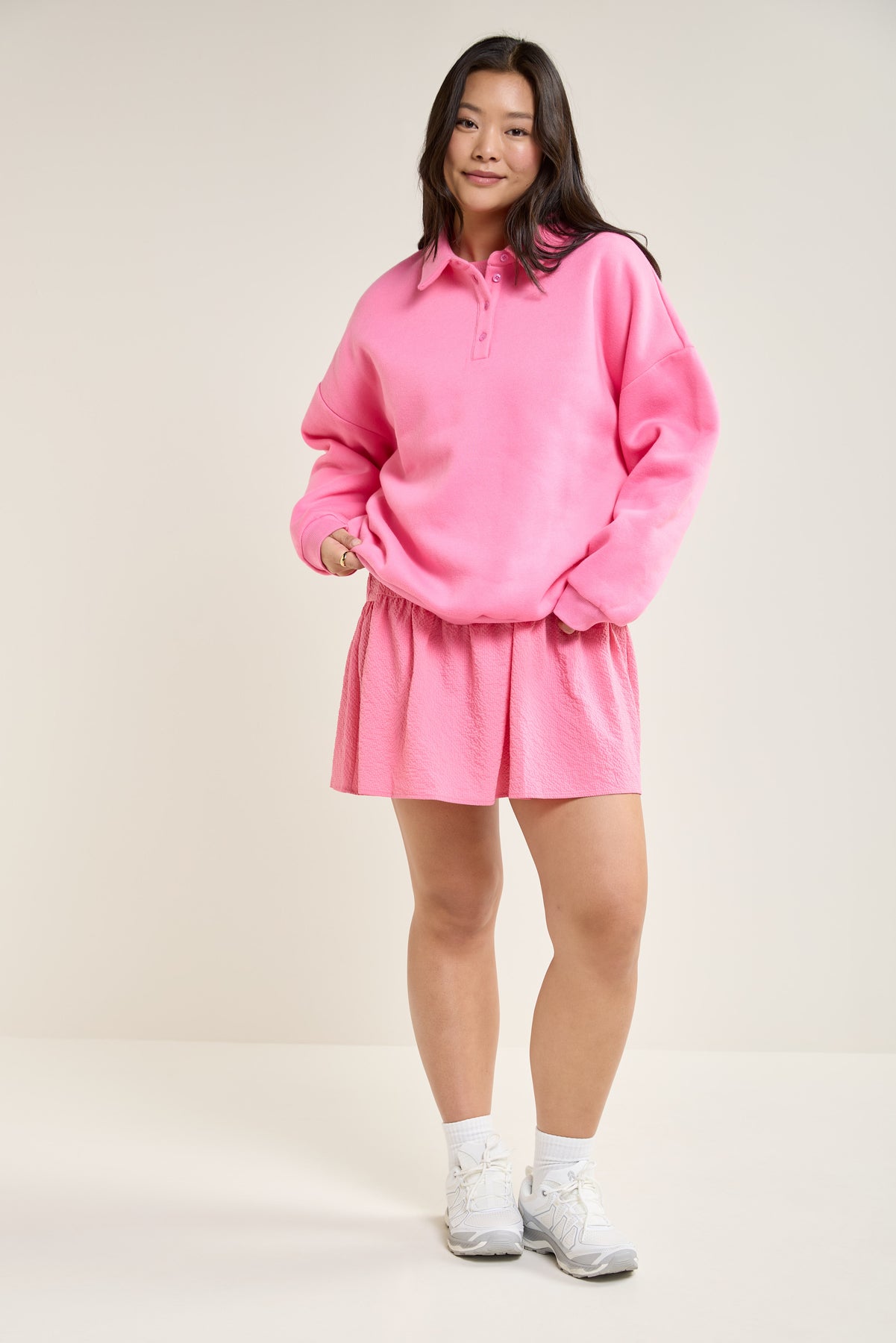 This ultra-comfortable fleece sweater revamps a classic style with its loose fit and buttoned polo collar, perfect for pairing with flowy pants or jeans.