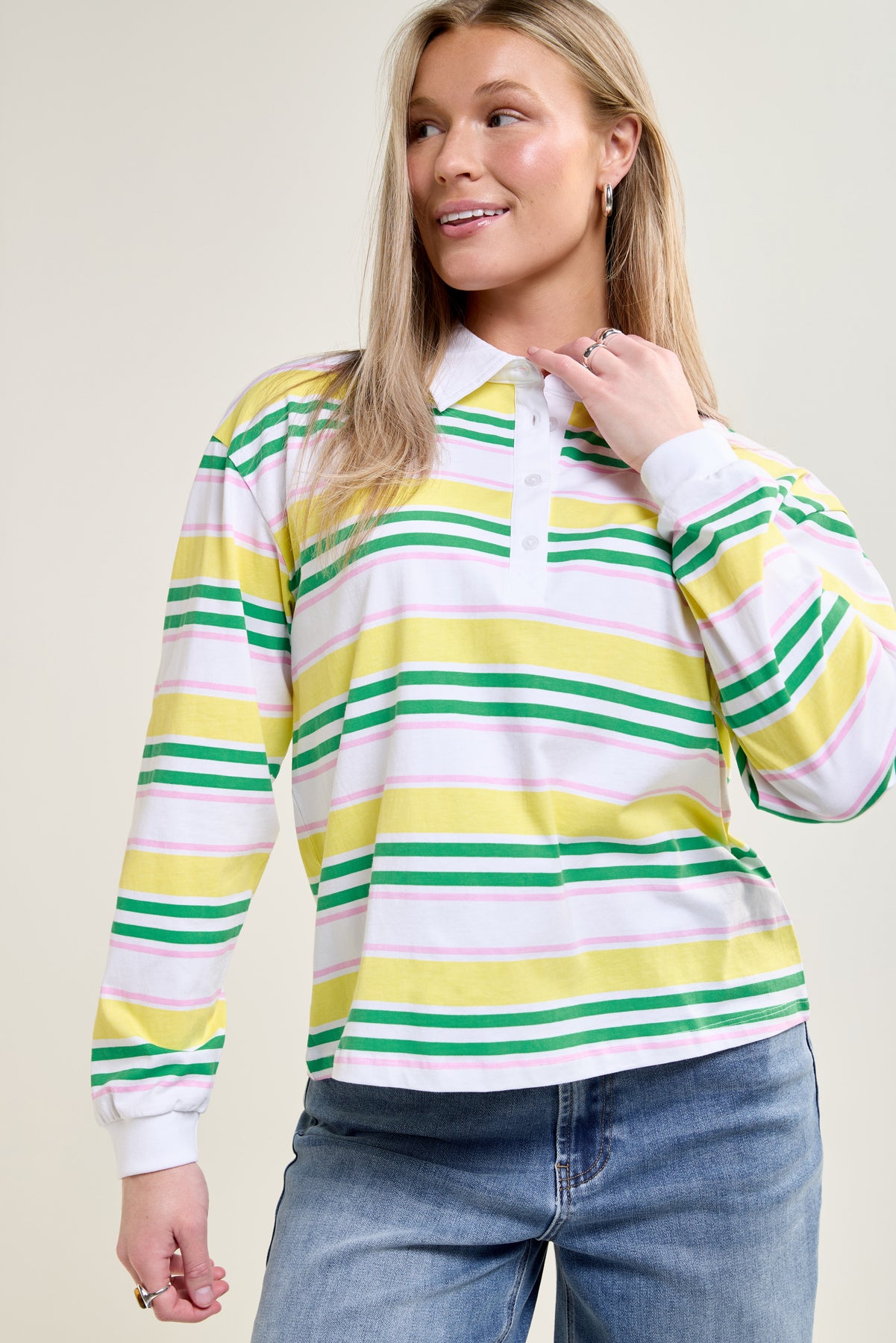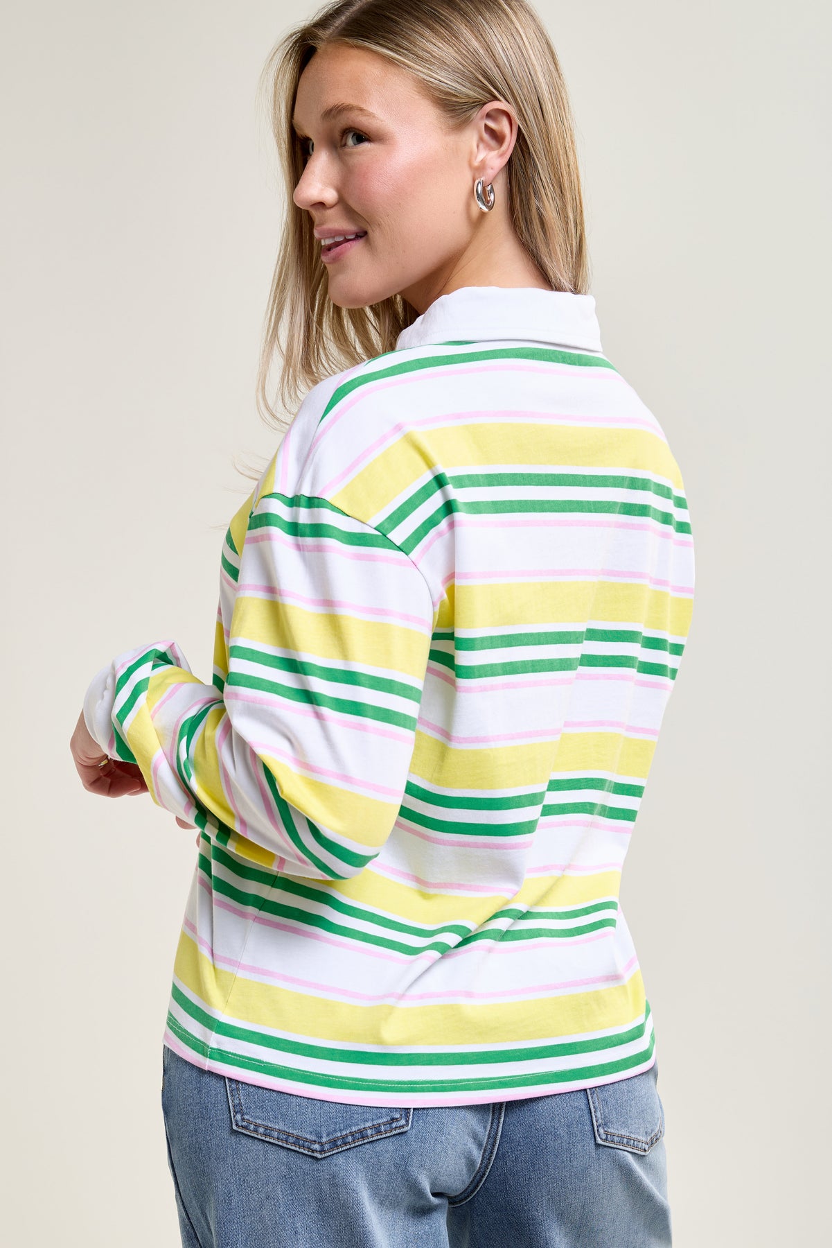 This loose-fitting cotton top features colorful stripes and a classic button-down collar. Wear it with neutral jeans or biker shorts for a casual, dynamic look.